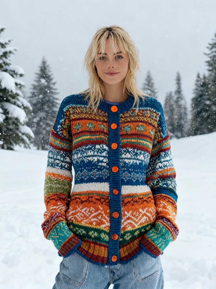 Women's Fair Isle Multicolor Striped Knit Cozy Knit Button Cardigan