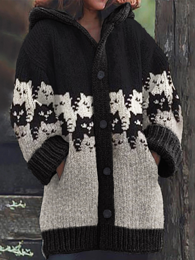Vintage Cats Colorblock Knit Cozy Hooded Cardigan
