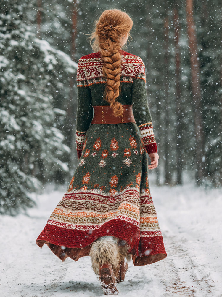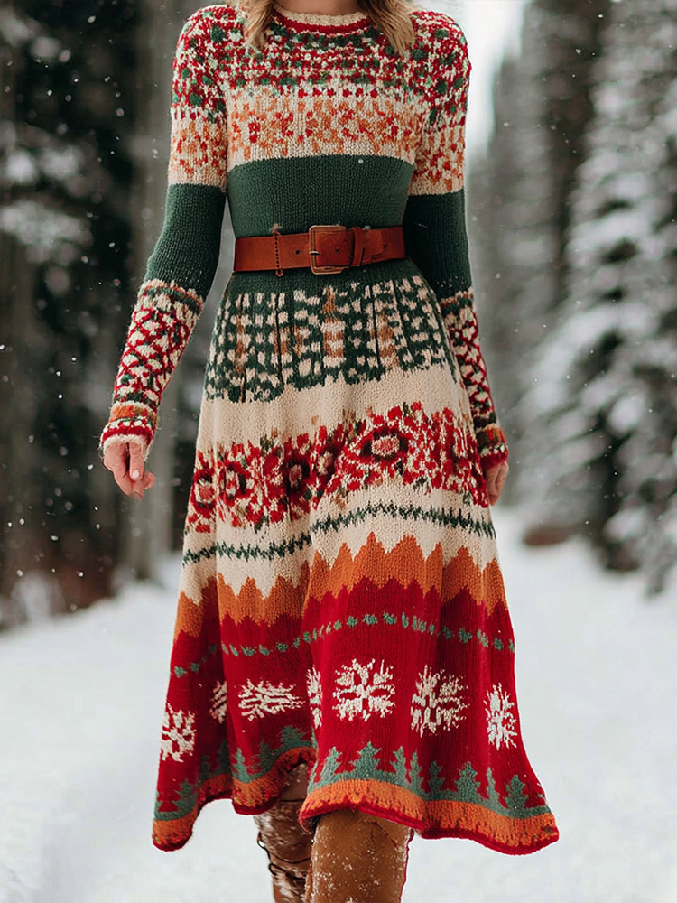 Retro Christmas Series Women's Round Neck Knitted Sweater Dress Long Dress