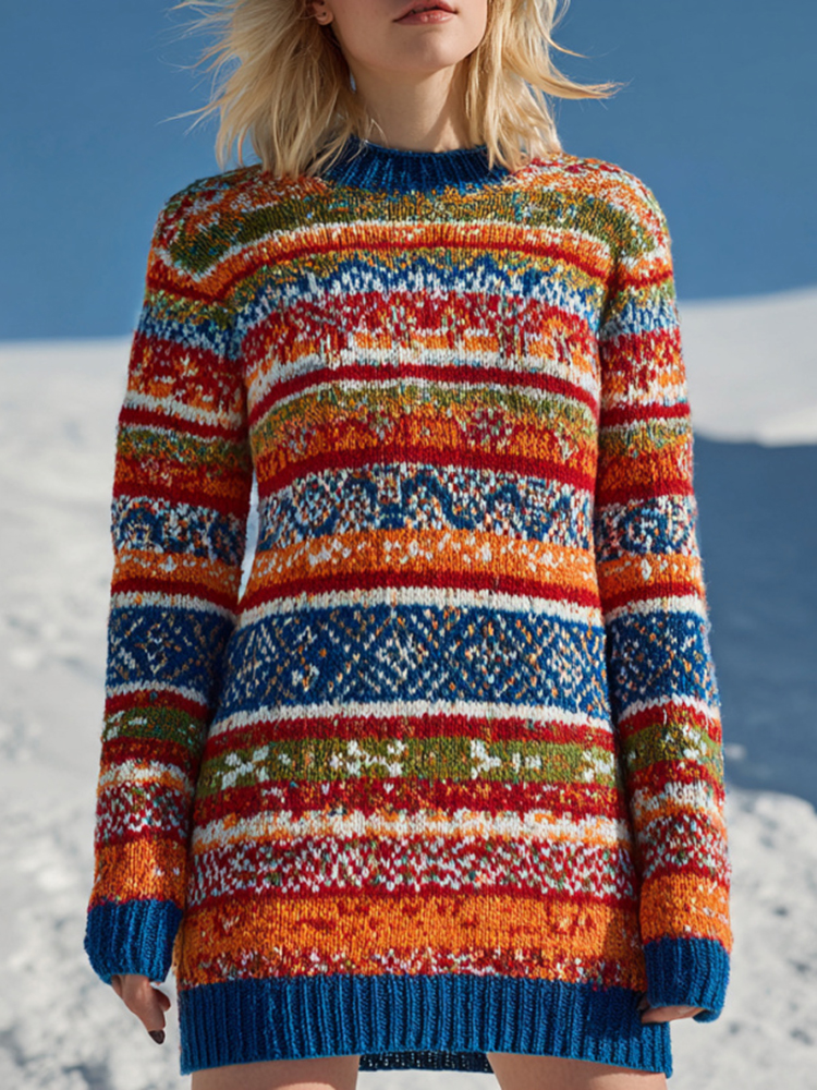 Women's Fair Isle Multicolor Striped Knit Cozy Knit Sweater Dress