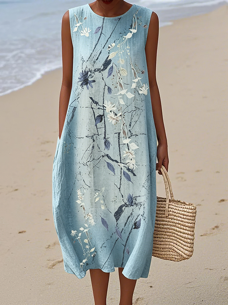 Women's Japanese Flower Art Round Neck Sleeveless Linen Blend Midi Dress