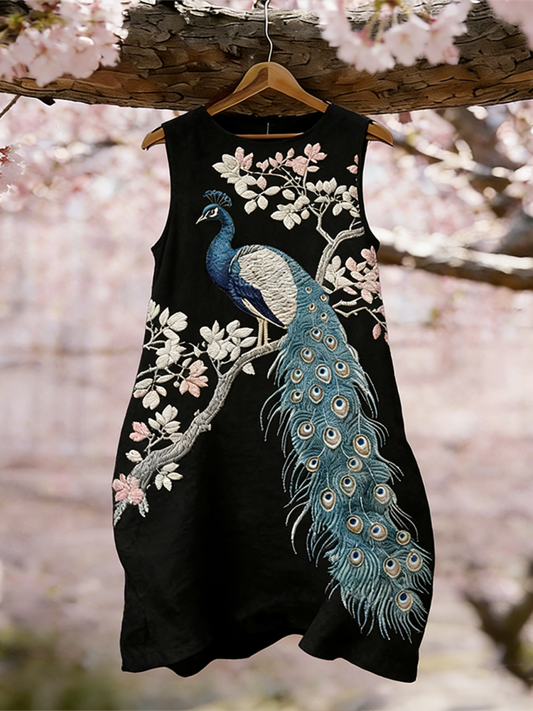Japanese Art Style Peacock And Cherry Blossom Pattern Embroidered Women's Linen Dress