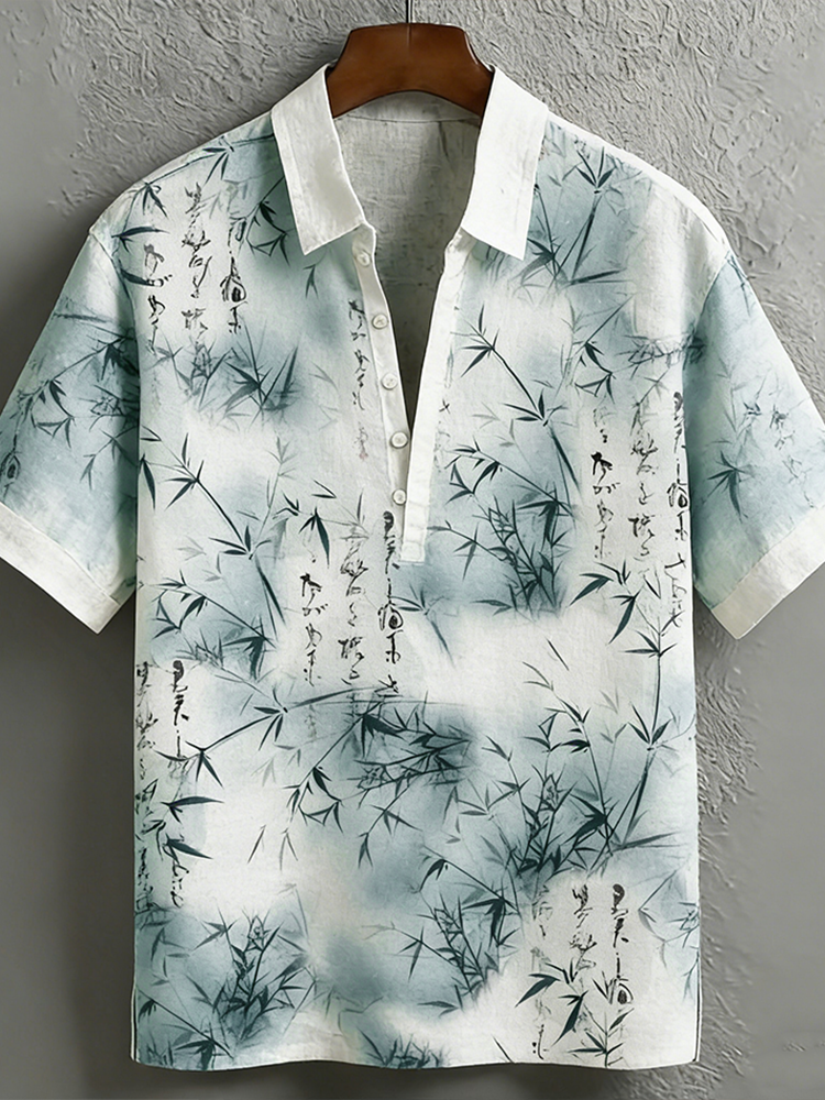 Japanese Art Bamboo Leaf Pattern Line Art Leisure Linen Shirt