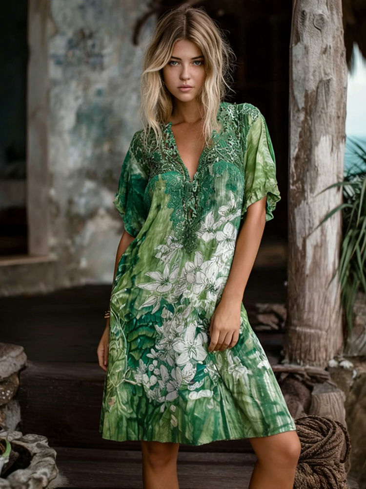 Vintage White Floral Art Embroidery Tie-dye Green Playful V-neck Dress