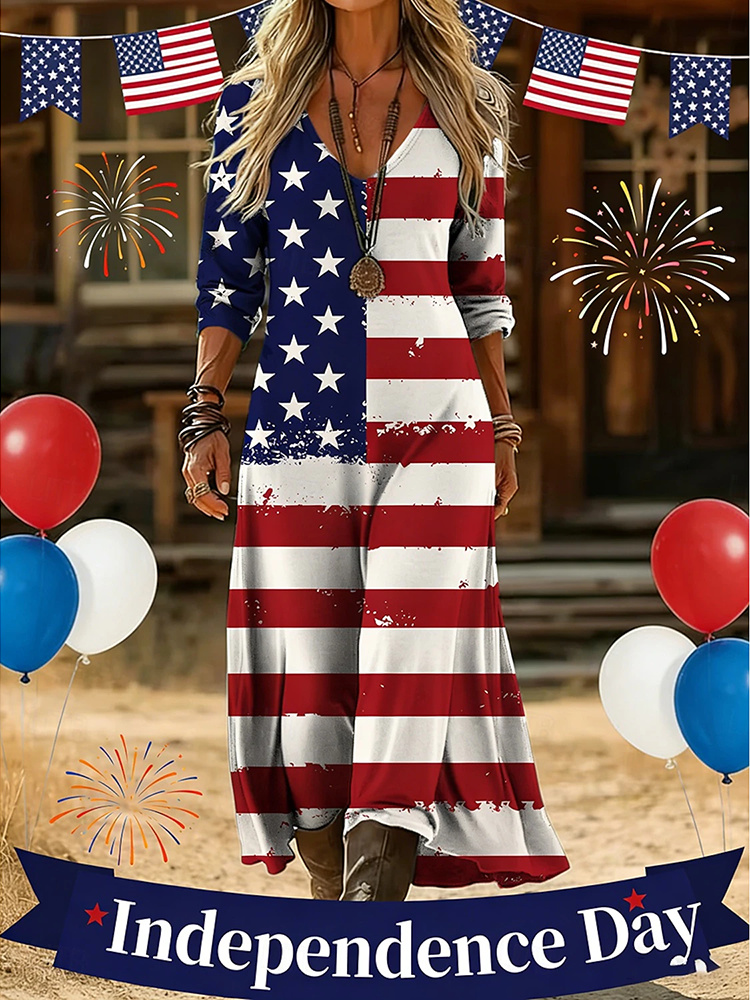 Women's Star Stripe Design V-neck Long Sleeve A-line Dress