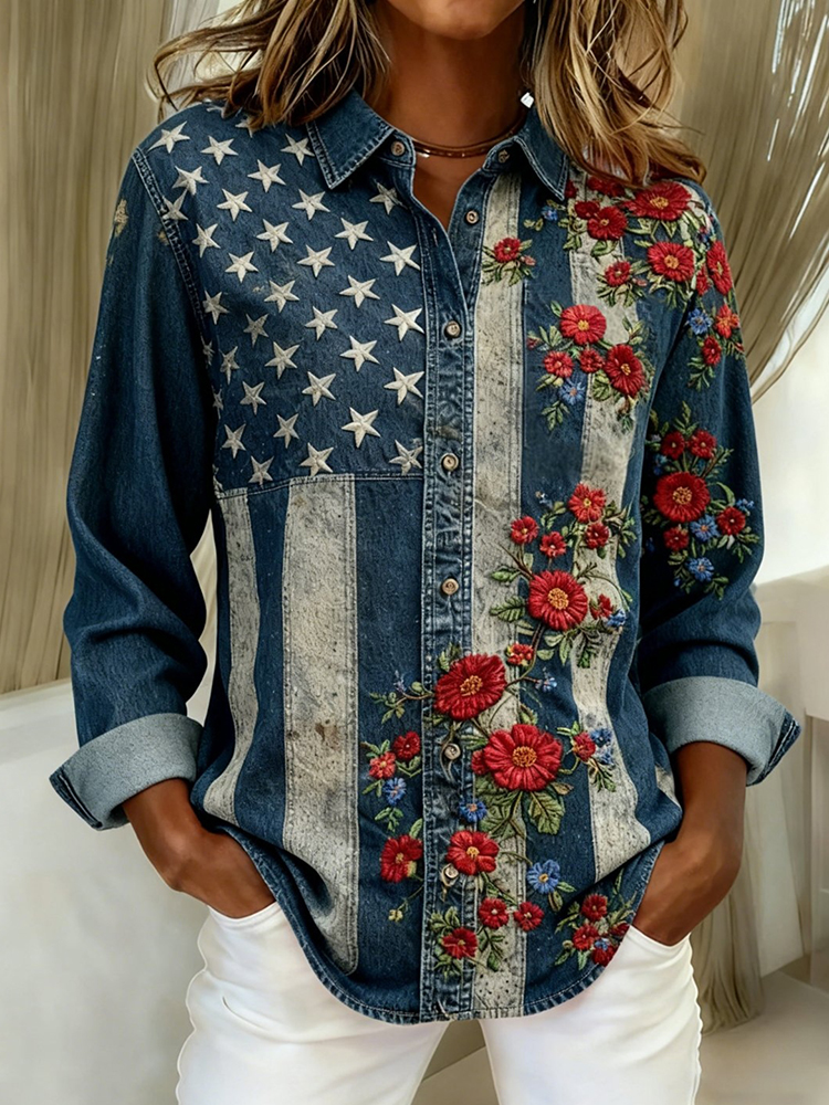Ethnicity Colorful Flowers Women's Vintage Art Print Casual Cotton And Linen Shirt