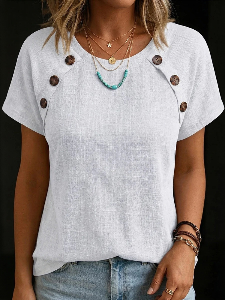 Sakura Pattern Embroidery Simple Casual Round Neck Linen Top