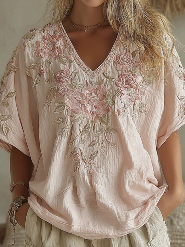 Elegant Pink Rose Embroidery Art Linen Blend Round Neck Short Sleeve Top