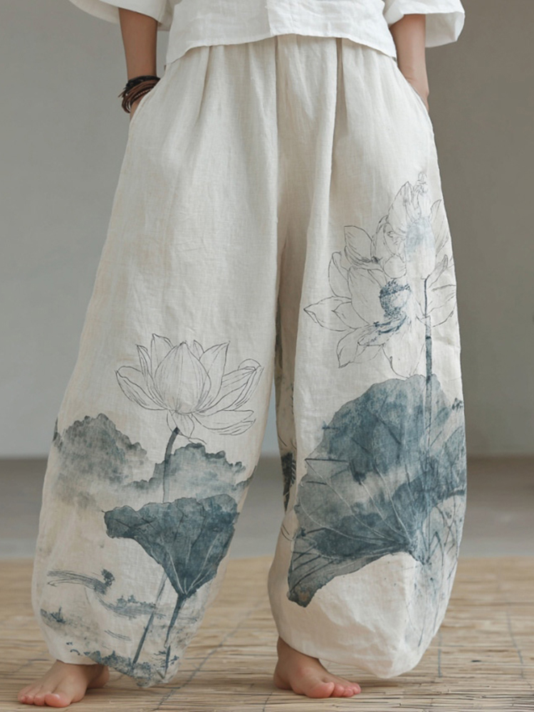 Women's Japanese-style Lotus Pattern Linen Trousers