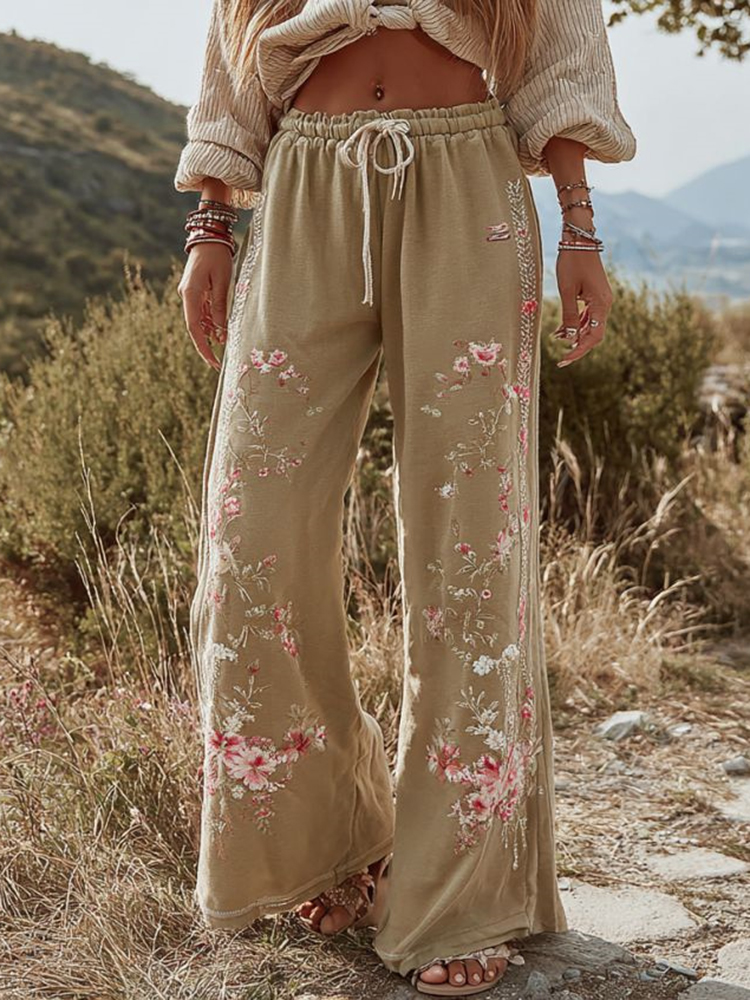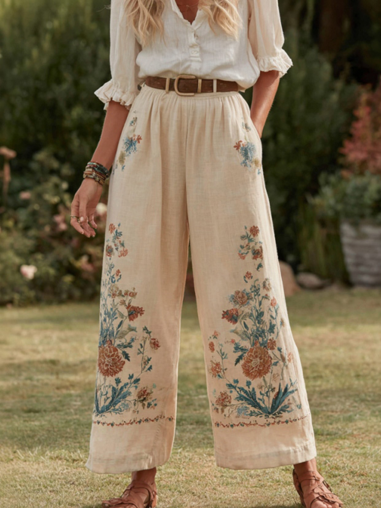 Women's Vintage Bohemian Floral Art Comfy Linen Pants