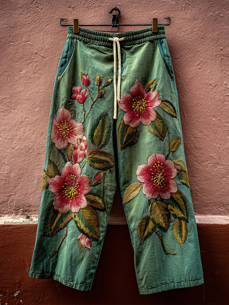 Women's Japanese Sashiko And Floral Pattern Linen Pants