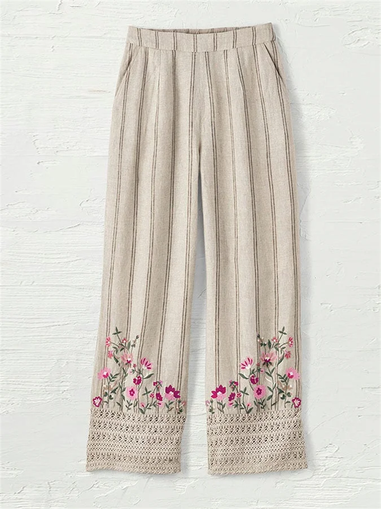 Women's Retro Stripe Stitching Lace Embroidery Casual Pants