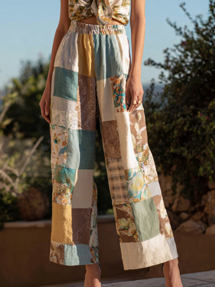 Vintage Boho Floral Patchwork Pattern Women's Linen Trousers
