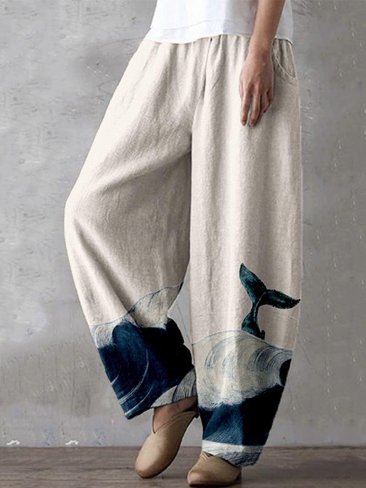 Whale Tail & Sea Waves Linen Blend Comfy Pants