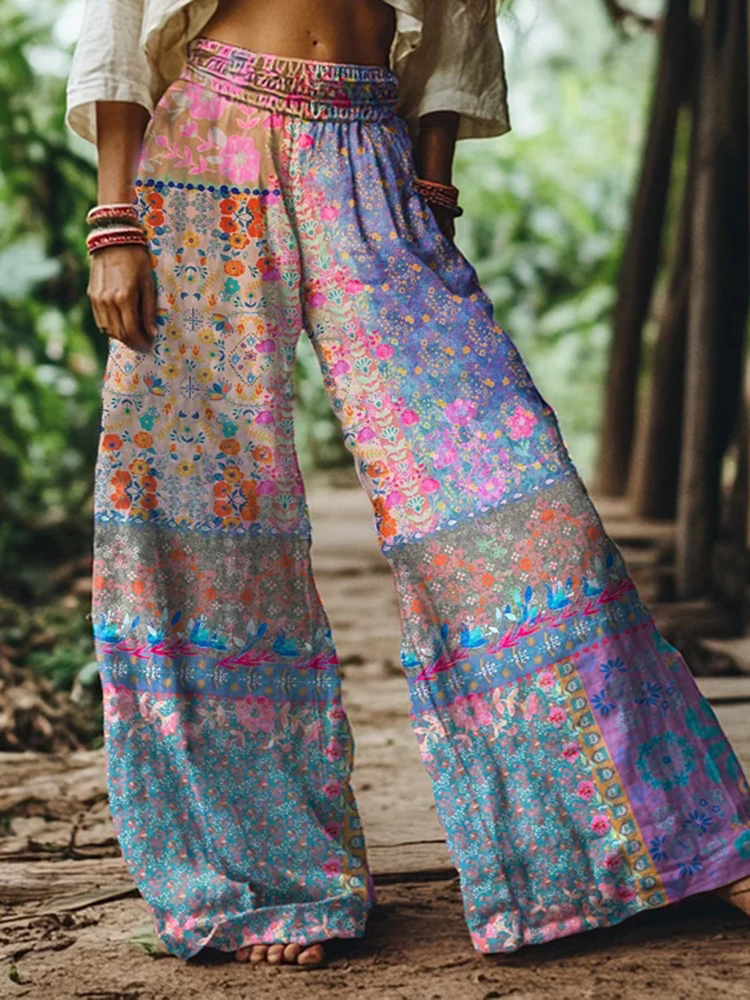 Boho Vintage Floral Patchwork Art Women's Linen Trousers