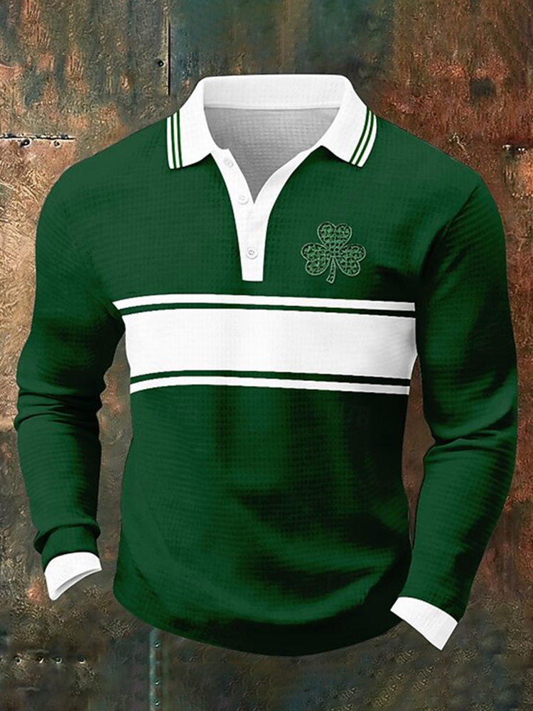 Men's Casual St Patrick's Day Shamrock Print Waffle Long Sleeve Polo Shirt