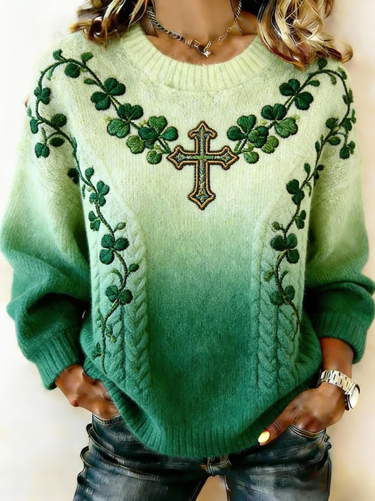 Women's St. Patrick's Day Clover Cross Print Crew Neck Sweater