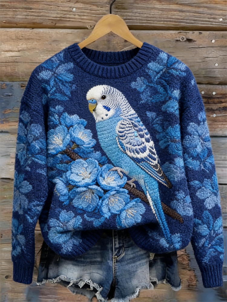 Classy Parrot & Blue Flowers Cozy Knit Sweater