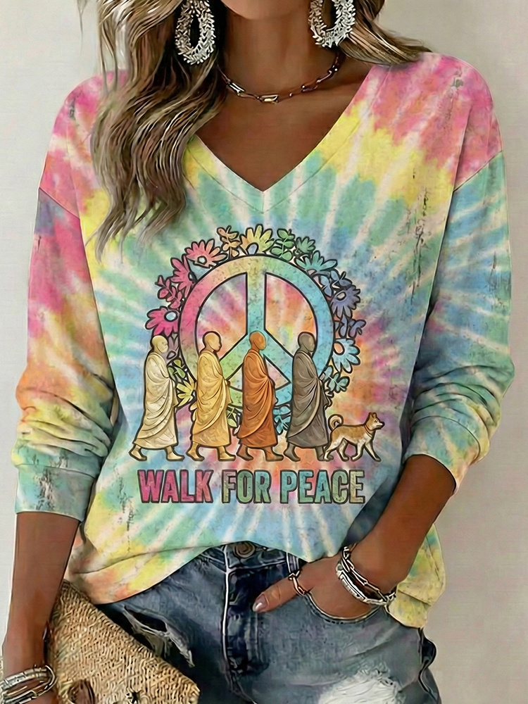 Women's Retro Walk For Peace Monks With Aloka Dog In Hippie Tie Dye Art Print V Neck Sweatshirt