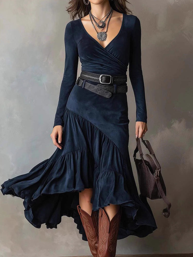 Retro Western Style Ruffled No-wash Denim Dress