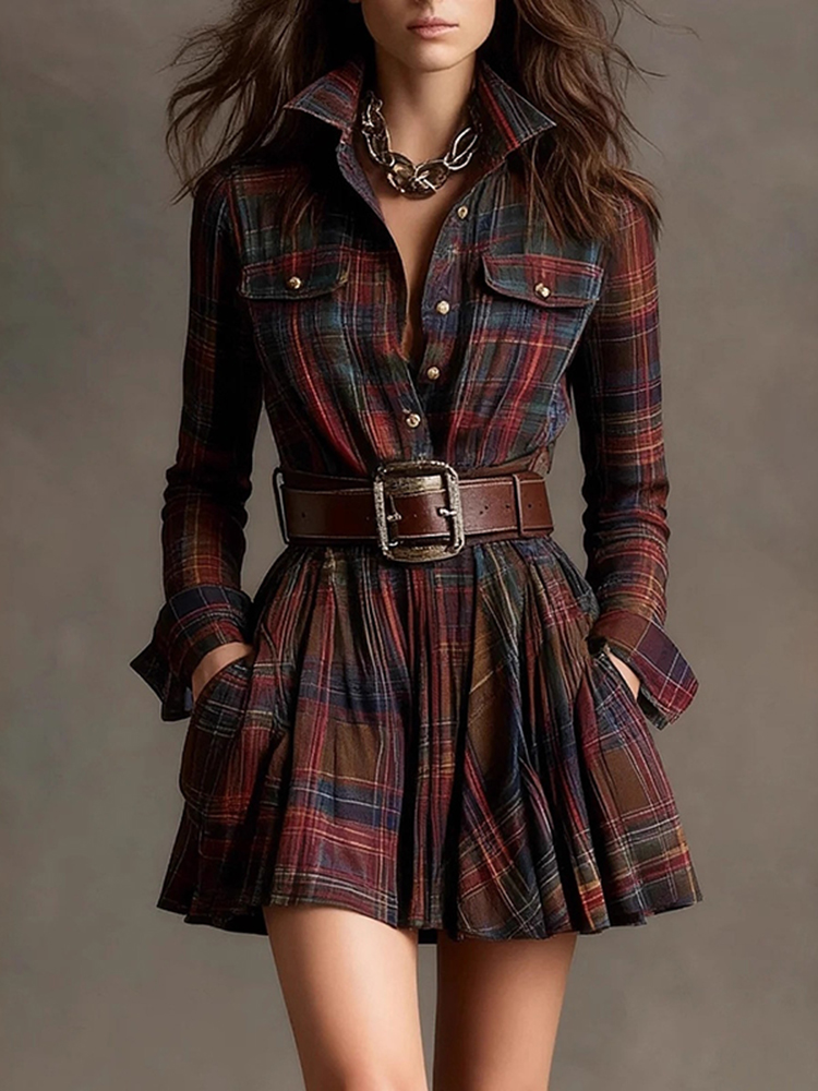 Vintage Plaid Slim Shirt Mini Dress(with Belt)