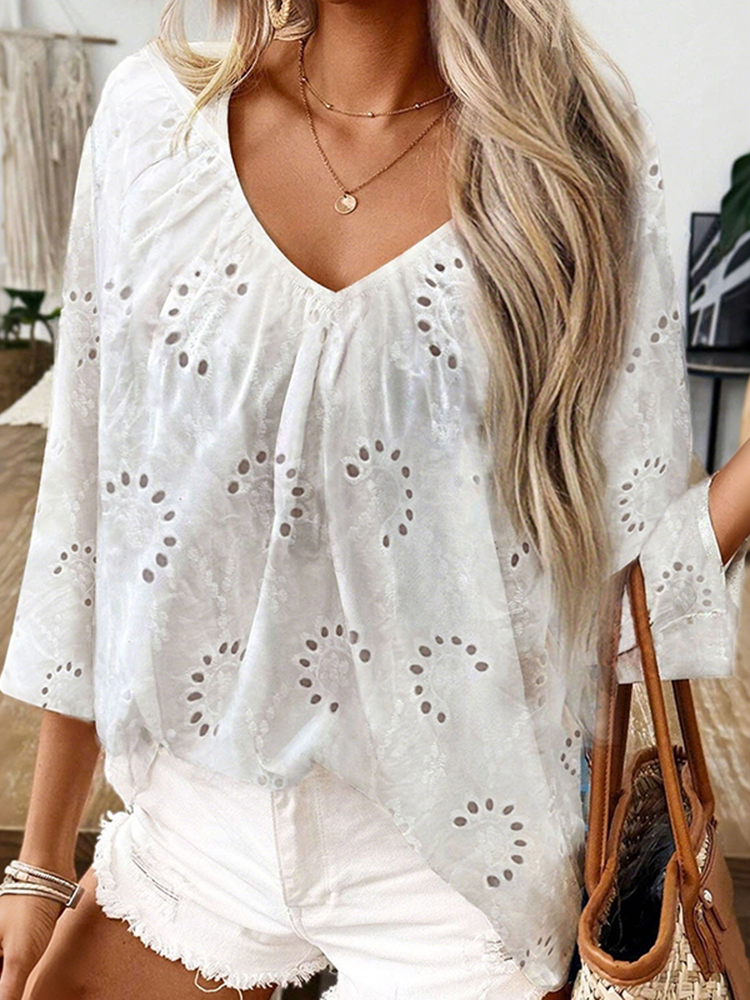 Women's Retro Lace Cotton And Linen Mid-length Sleeves V-neck Top