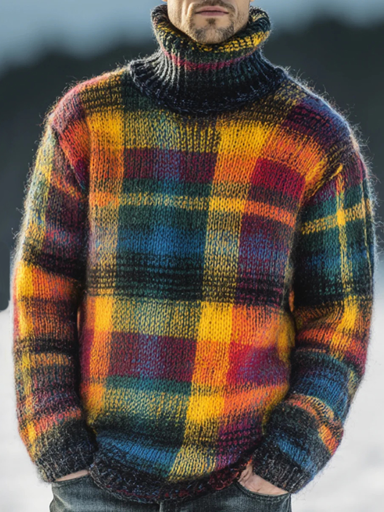 Vintage Colorful Plaid Print Knit Turtleneck Pullover Sweater