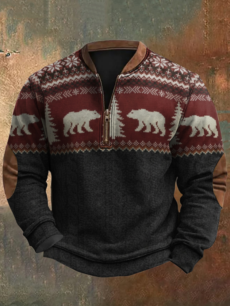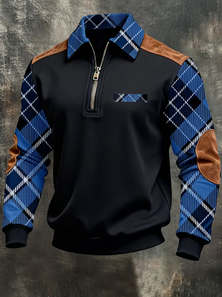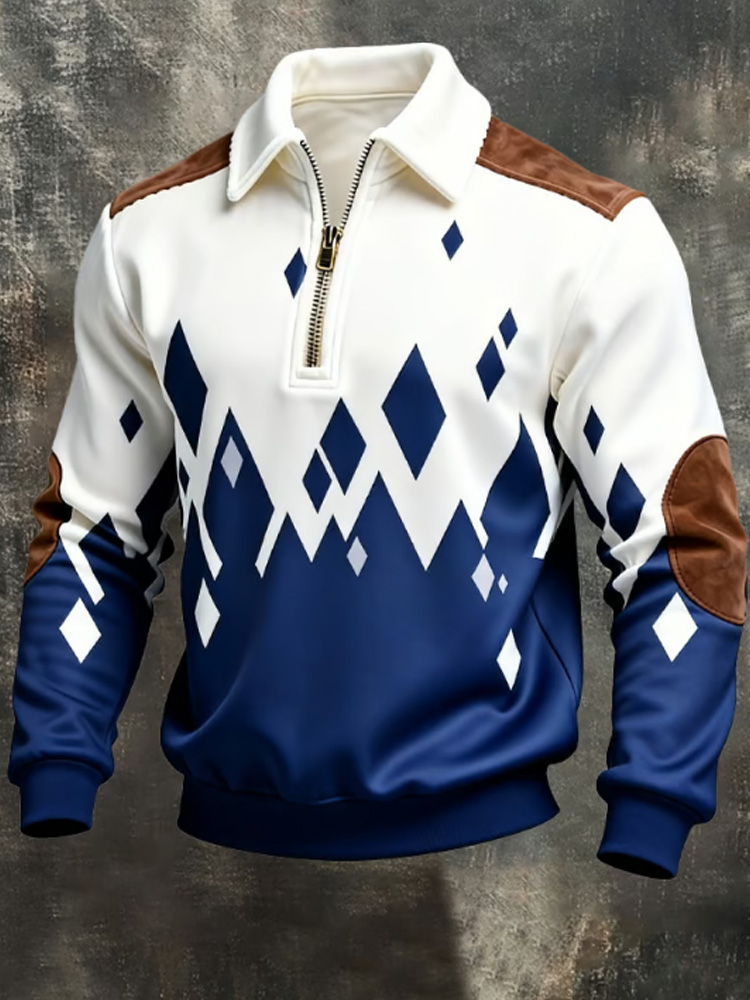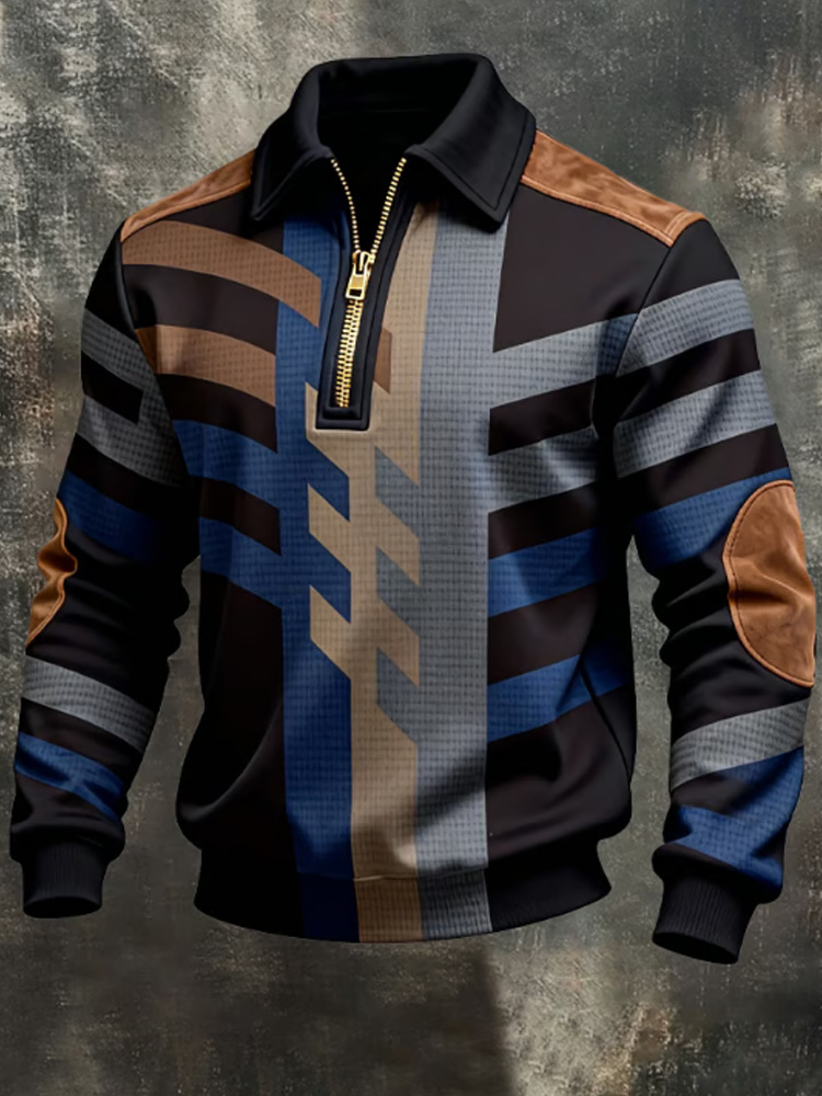 Men's Retro Color Block Print Zipper Sweatshirt