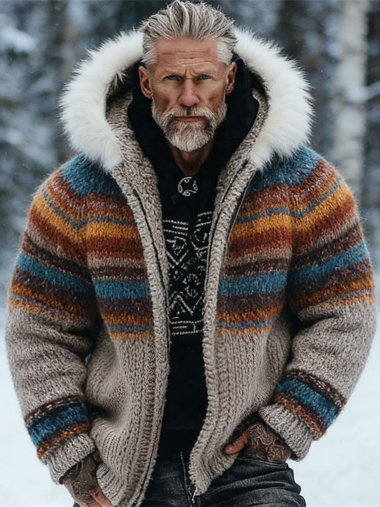 Vintage Striped Contrast-color Men's Knit Fur Trimmed Hooded Jacket