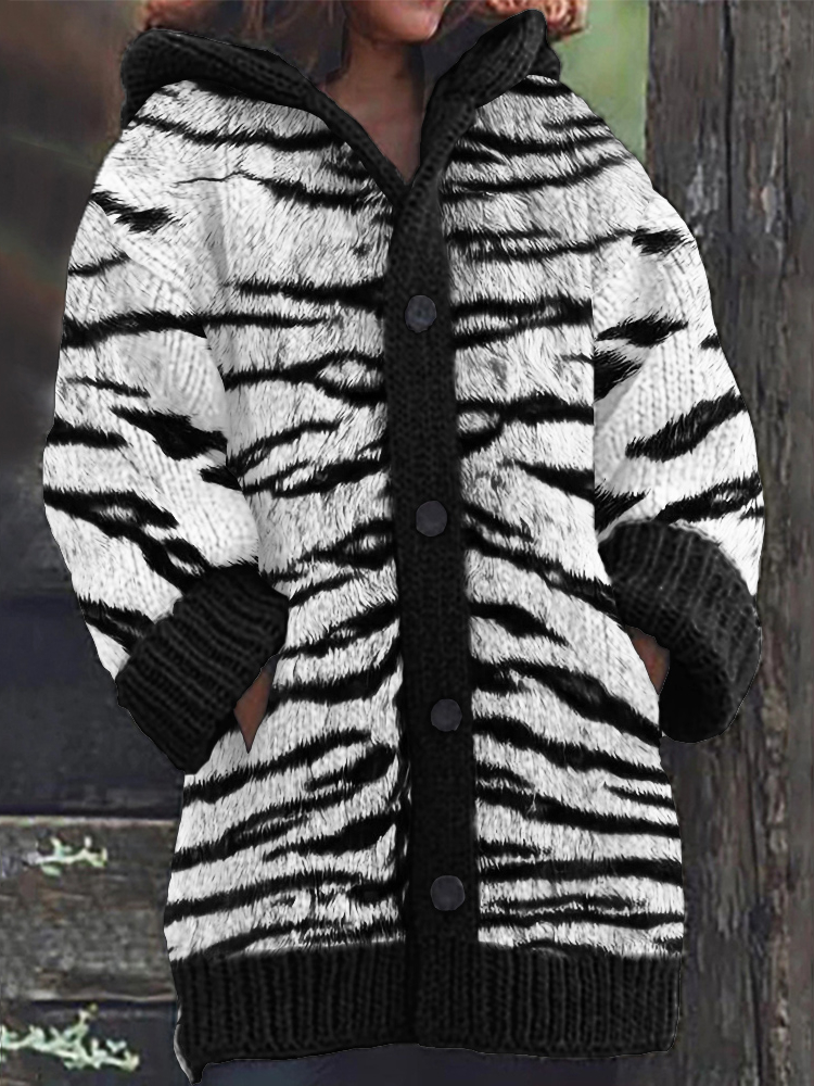 Vintage Tiger Stripes Pattern Cozy Hooded Cardigan
