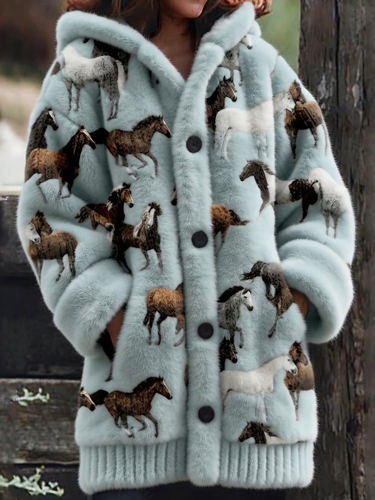 Western Wild Horses Art Plush Cozy Knit Hooded Cardigan
