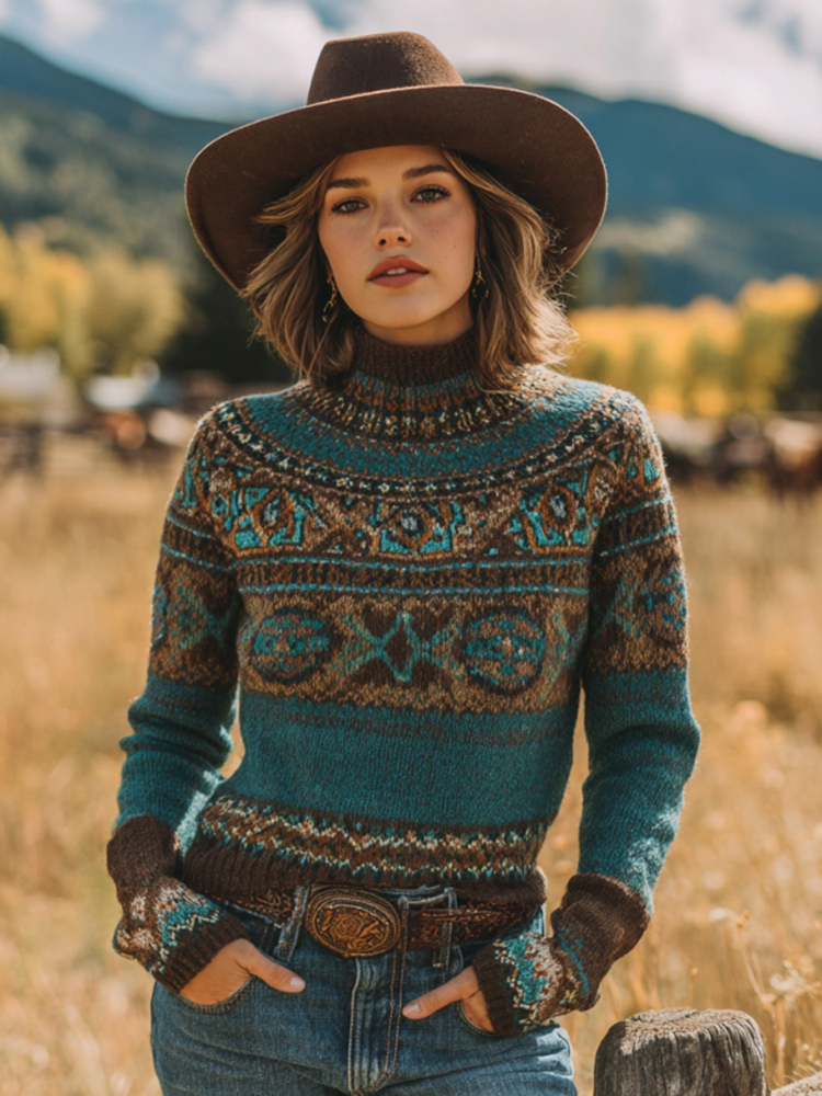 Women's Vintage Western Geometric Art Print Knit Turtleneck Sweater
