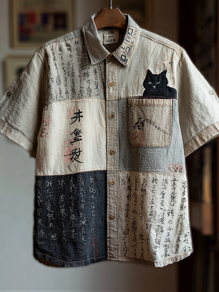Japanese Calligraphy And Cat Art Patchwork Embroidered Washed Short Sleeve Shirt