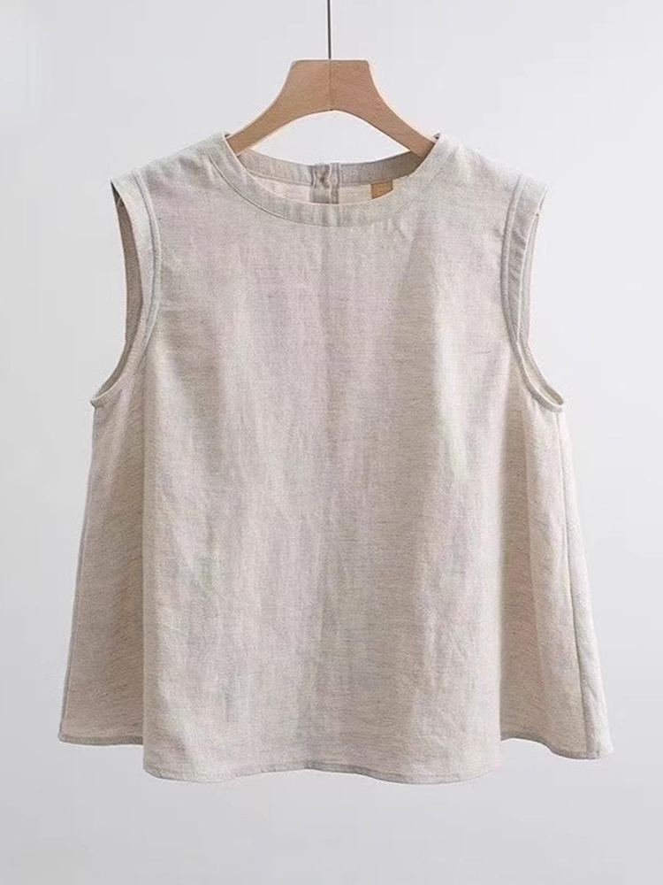 Women's Solid Color Lace Retro Round Neck Cotton Linen Sleeveless Top