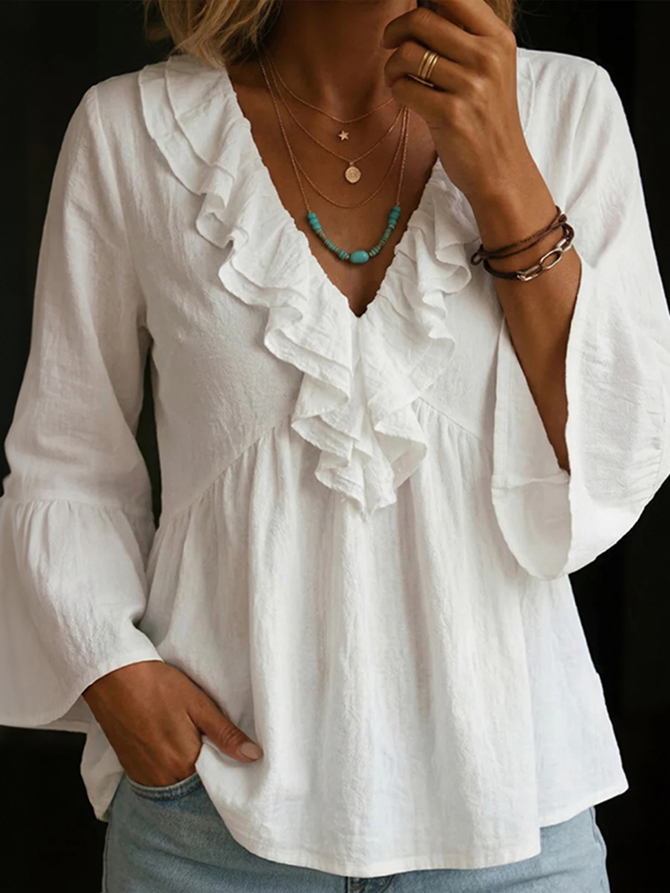 Women's Solid Color Ruffle V Neck Blend Loose T-shirt
